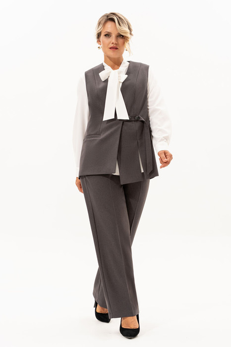 Нарядно- повседневный комплект   это идеальное решение для Вашего гардероба. Комплект  состоит из трех  предметов - прямые брюки с высокой посадкой прямого кроя на молнии и на резинке, с боковыми карманами сочетаются  с любыми базовыми вещами. Универсальный классический жилет с V-образным  вырезом горловины превосходно садится по фигуре, на правой полочке обработан прорезной карман с листочкой, на левой разрез , застежка обработана  на отлетном хлястике ,на петлю и пуговицу.  Этот элемент делает  его более интересным. Жилет на подкладке . Ассиметричный жилет можно одевать поверх тонкой одежды. Прекрасная классическая блуза с воротником - бантом имеет прямой крой, поэтому отлично подходит для любого типа фигуры. Спинка со средним  швом. По переду блузы есть рельефы от плечевого шва, в боковых швах - небольшие разрезы. Блуза изготовлена из приятной к телу ткани, гладкая фактура  не мнётся и сохраняет свой первоначальный вид даже после многократных стирок. Рукав втачной, одношовный,  длинный с манжетой на две петли и пуговицы. Комфортная модель для работы и просто для повседневного применения, так и к композиции нарядного ансамбля. Элегантная блуза с бантом - утончённая  универсальность, комфорт.  Базовый брючный комплект идеален для повседневного  образа- деловая встреча, в офис.  Современный  комплект  также будет хорошо смотреться как вечерний наряд на различные мероприятия, праздники, день рождения, корпоратив. Шикарный нарядный станет незаменимым в Вашем гардеробе . Этот комплект подчеркнет Вашу уверенность и стиль.