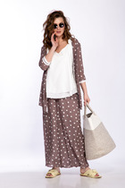 Брюки: «палаццо», свободные, прямого силуэта. Верхний срез брюк обработан поясом и шлевками для фиксации ремня. В боковых швах расположены накладные карманы. На передних и задних половинках застежка на гульфик (тесьму-молнию), а также по две складки, застроченные сверху до определенного уровня, направлены к боковому шву. На передних и задних половинках заутюжены «стрелки». На задних половинах расположены по две талевые вытачки.