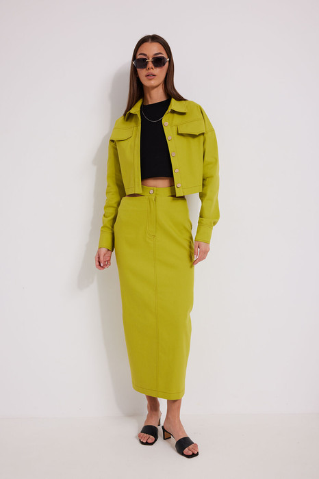 Комплект трехпредметный, состоит из жакета, юбки и топа. Комплект выполнен из джинсовой ткани и топа из трикотажного полотна.