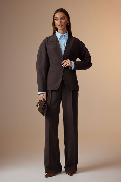 Брюки: расширенного силуэта, со стрелками, с притачным поясом, застегивающимся на одну пуговицу. На поясе расположены шлевки. Застежка брюк с гульфиком на "тесьму-молнию". Брюки с наклонными карманами к боковому шву. Передняя половина брюк с одной направленной складкой. На задних половинах брюк расположены талевые вытачки.