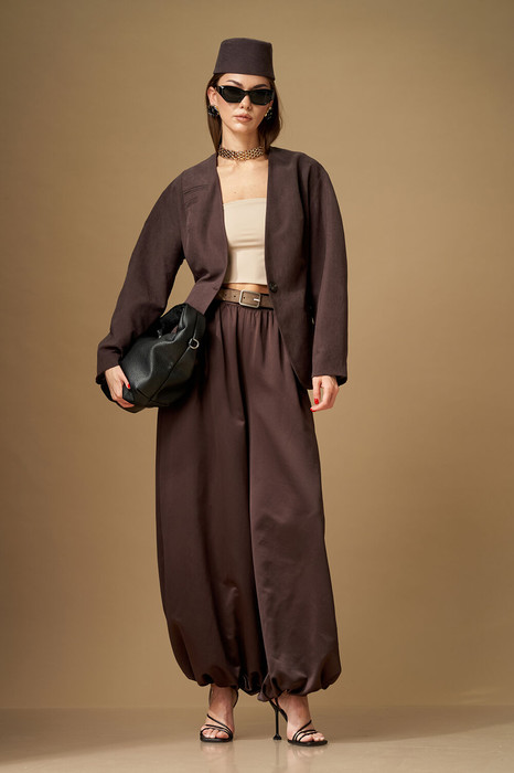 Брюки свободной формы, с низкой посадкой, сильно расширенные и собранные снизу на резинку. Верхний срез обработан поясом на резинке, центральная часть переда без резинки. Брюки по силуэту называются «алладины».