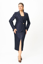 Жакет полуприлегающего силуэта, с пиджачным воротником, застежка на две пуговицы. На полочке шлицы  с декоративными шлицами. Спинка со средним швом. Рукав втачной, длиной три четверти, регулируется патой. Брюки прямые, пояс на резинке, карманы в боковых швах.