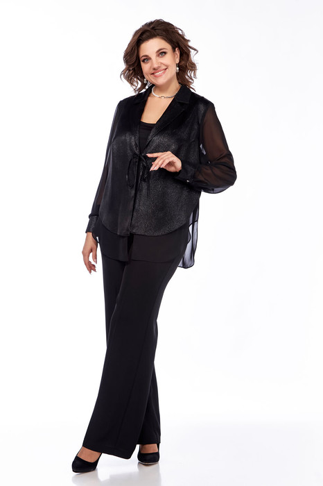 Нарядный трехпредметный комплект. Блузка полуприлегающего силуэта, комбинированная из двух блузочных  полупрозрачных тканей, воротник пиджачного типа, застегивается на завязку, низ блузки фигурный. По спинке отрезная кокетка, от которой заложена бантовая складка. Рукав втачной длинный, на манжете с застежкой на петлю и пуговицу. Топ без рукавов с округлым вырезом горловины. Брюки прямого силуэта, пояс на резинке по спинке застежка на молнию, петлю и пуговицу. Карманы от пояса к боковому шву.