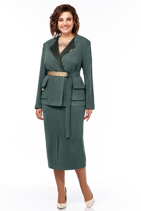 Шикарный костюм тройка из мягкого приятного велюра. Жакет без подкладки, полуприлегающего силуэта, с втачными рукавами, с двубортной застежкой на две петли и пуговицы. Жакет без воротника с отложными лацканами из отделочной ткани. Также отдека используется на рукавах и карманах настрочных на полочке, еще для отделки используется тесьма на клапане, поясе из основной ткани и лацкане.  Блузка полуприлегающего силуэта со спущенным рукавом, в боковых швах разрезы. Юбка удлиненная, прямого силуэта. слегка заужена к нзу. По центру спереди разрез, застежка по спинке на пуговицу и тесьму -молнию.