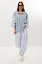 Стильный комплект. Жакет прямого силуэта, воротник с лацканали, застежка на две пуговицы, в боковых швах имитация шлиц с двумя пуговицами. Рукав спущенного кроя, три-четверти с патой на 1 пуговицу. Брюки свободного кроя на резинке, карманы в боковых швах, по низу имитации шлиц и две пуговицы. Блуза однотон, линия плеча спущена.