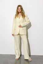 Костюм полуприлегающего силуэта. Элегантный костюм с интересным кроем не оставит Вас равнодушной. Жакет на подкладке с воротником пиджачного типа. Срез борта фигурной формы. По переду рельефы, между которыми декоративный элемент в виде шнуровки. Прорезные карманы в рамку, спинка со средним швом и рельефами. Рукав длинный двухшовный. Брюки слегка расклешенные, на поясе, с застежкой на молнию и петлю и пуговицу. По спинке пояс на резинке. Заутюженные канты по передним и задним полотнищам. Карманы к боковым швам.