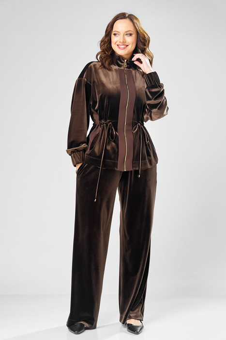 Костюм повседневный из бархатного полотна, состоящий из джемпера и брюк. Джемпер полностью на молнии по переду, вдоль молнии отделочная планка. Воротник-стойка. Вдоль бокового шва планка из отделочной ткани. Карманы в боковых швах. В области талии кулиска, в которую продет шнур из основной ткани. Рукав одношовный с притачной манжетой. Брюки заужены к низу, на поясе. Пояс на резинке, слева завязка из отделочной ткани. Карманы в боковых швах.