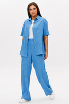 Брюки по форме прямые, с заутюженными стрелками и с боковыми полукруглыми карманами. Верхний срез обработан поясом с резинкой в задней части брюк. На задних половинках расположены талиевые вытачки. На передних половинках – застежка на гульфик.