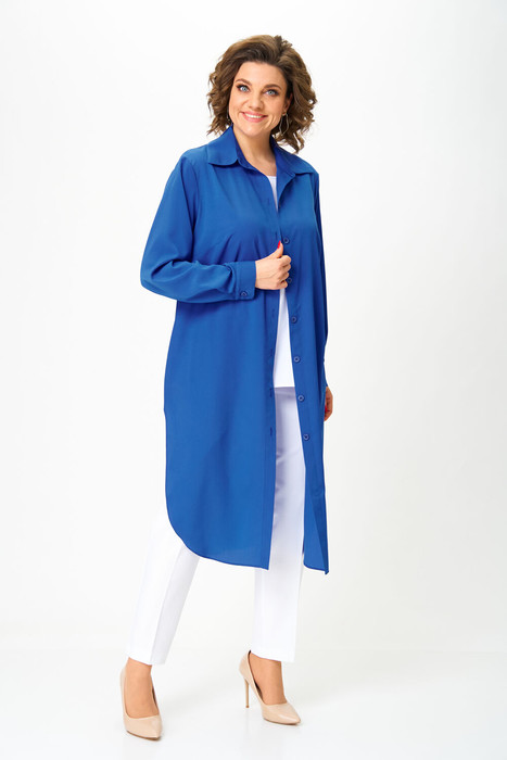Блуза прямого силуэта, втачного покроя с центрально-бортовой застежкой на планку, цельнокроеную на петли и пуговицы. Блуза удлиненная, с закругленными высокими разрезами. Рукав длинный с манжетой на одну петлю и пуговицу. Горловина оформлена воротником стояче отложным с притачной стойкой. По переду расположены нагрудные вытачки,  идущие из бокового шва. На спинке расположена кокетка горизонтальная. На нижней части спинки расположена встречная складка. К блузе прилагается декоративный пояс фантазийной формы, с помощью которого можно приталить блузу.