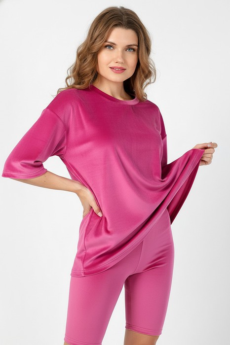 Костюм из гладкокрашеного трикотажного полотна «велюр стрейч», состоящий из футболки и леггинсов. Футболка – удлиненная, свободного покроя, со спущенной, линией плеча, короткими втачными рукавами, горловиной овальной формы, обработанной втачной планкой.Леггинсы – длиной до колен, с эластичной тесьмой по талии.