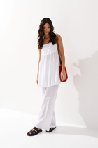 Текстильный костюм-двойка из трапециевидного жакета с высокой шлицей по спинке и прямых брюк со стрелками. Детали: свободный покрой, пиджачный воротник, талиевые вытачки, функциональный нагрудный карман, прорезные карманы с клапанами, застежка на пуговицы, спинка со средним швом и высокой шлицей, рукава втачные двухшовные, жакет на подкладке. Брюки с высокой посадкой на притачном поясе со шлевками, передние половины с небольшими застроченными мягкими складками и заутюженными стрелками, застежка на молнию и пуговицу, боковые карманы.