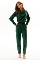 Детали: жакет полуприлегающего силуэта, пиджачный воротник, перед с прорезными карманами, двубортная застежка на петли и пуговицы, спинка со средним швом, рукава втачные двухшовные, жакет на подкладке. Брюки с высокой посадкой на притачном поясе со шлевками, застежка на молнию и пуговицу, боковые карманы, передние половины с заутюженными стрелками и двумя небольшими складками.