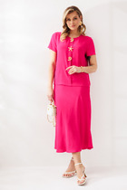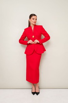 Длина жакета по спинке около 66 см в размерах 40-46 и около 69 см в размерах 48-52, длина рукавов около 61 см. Длина брюк по боковому шву с поясом около 97 в размерах 40-46 и около 98,5 см в размерах 48-52, длина по внутреннему шву около 70 см.