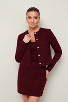 Костюм-двойка из оверсайз жакета и прямой мини-юбки из фактурной ткани. Детали: жакет прямого силуэта, расширенная линия плеч, пиджачный воротник, перед с прорезными функциональными карманами, однобортная застежка на петли и пуговицы, спинка со средним швом и шлицей, рукава втачные двухшовные, жакет на подкладке. Юбка на притачном поясе, застежка сзади на потайную молнию, юбка на подкладке.