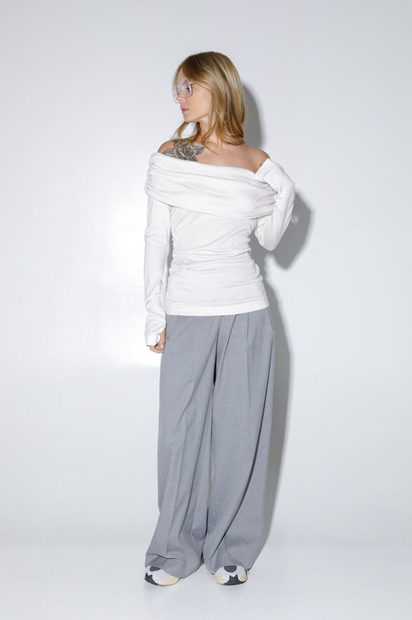Комплект-двойка из трикотажного джемпера с открытыми плечами и текстильных брюк-палаццо с небольшими складками у пояса и стрелками. Детали: джемпер прилегающего силуэта, длинные рукава с прорезями для пальцев, боковые швы со сборкой. Брюки с притачным поясом со шлевками, застежка на молнию и пуговицу, боковые карманы. Задние части брюк с вытачками и имитацией карманов. Брюки из плотной текстильной ткани в рубчик.