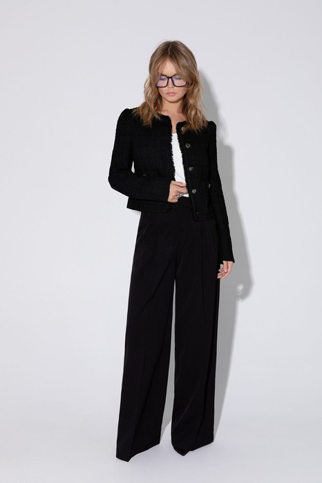 Костюм-двойка из укороченного жакета из фактурной ткани в стиле «шанель» и брюк-палаццо.