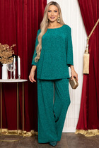 Длина жакета по спинке около 72 см в размерах 40-46 и около 74 см в размерах 48-52, длина рукава около 61,5 см. Длина брюк по боковому шву с поясом около 99 см в размерах 40-46 и около 100,5 см в размерах 48-52, длина по внутреннему шву около 69,5 см