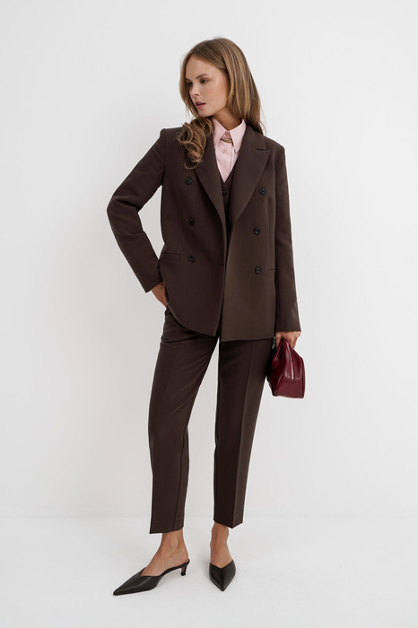 Текстильный костюм-двойка из двубортного жакета и укороченных брюк со средней посадкой.