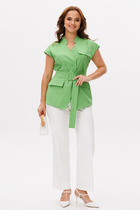 Детали: рубашка прямого силуэта, спущенная линия плеча, застежка на петли и пуговицы, длинные рукава с притачными манжетами, фигурный низ. Широкие брюки-палаццо с небольшими складками у пояса и заутюженными стрелками, притачной пояс со шлевками, застежка на молнию и пуговицу, боковые карманы. Задние части брюк с вытачками и имитацией карманов. Галстук в комплекте.