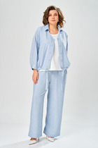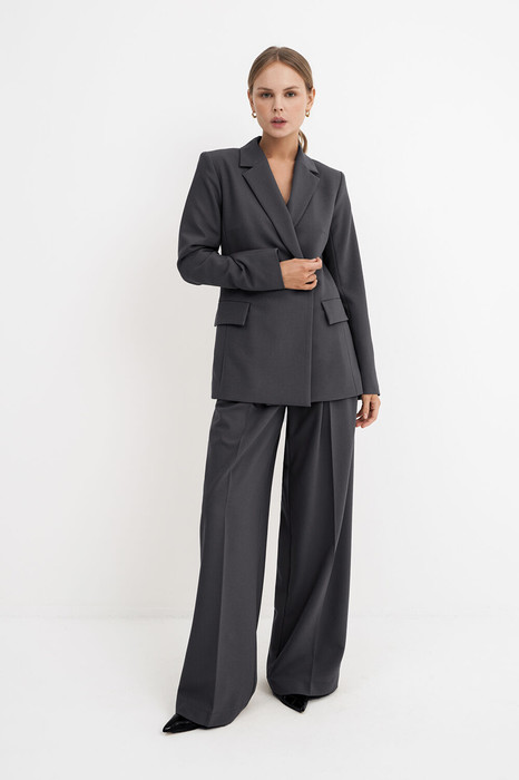Текстильный костюм-двойка из приталенного двубортного жакета и широких брюк-палаццо.