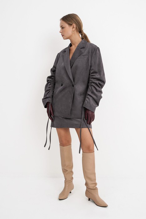 Костюм-двойка из свободного жакета и мини-юбки из замшевой ткани.