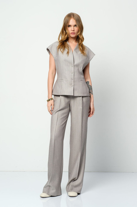 Костюм-двойка из приталенного жилета с воротником-стойкой и широких прямых брюк из текстильной ткани с рисунком «ёлочка».