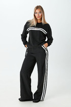 Детали: прилегающий силуэт, воротник с застежкой-поло, втачные длинные рукава расширенные к низу. Юбка прямого силуэта, пояс на резинке, спинка с высоким разрезом. Юбка на трикотажной подкладке.