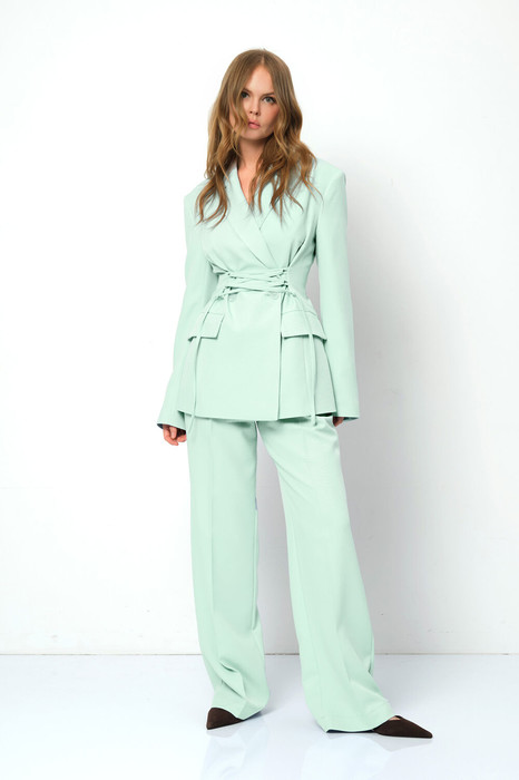 Костюм-двойка из жакета со шнуровкой и широких прямых брюк.