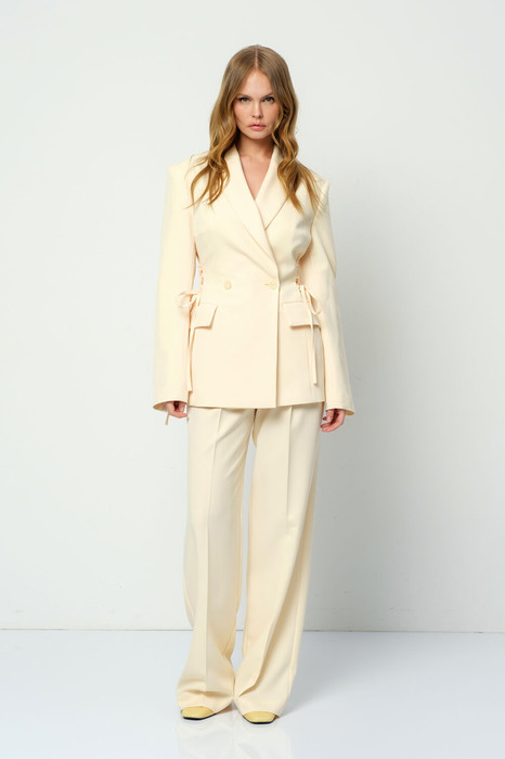 Костюм-двойка из жакета со шнуровкой и широких прямых брюк.