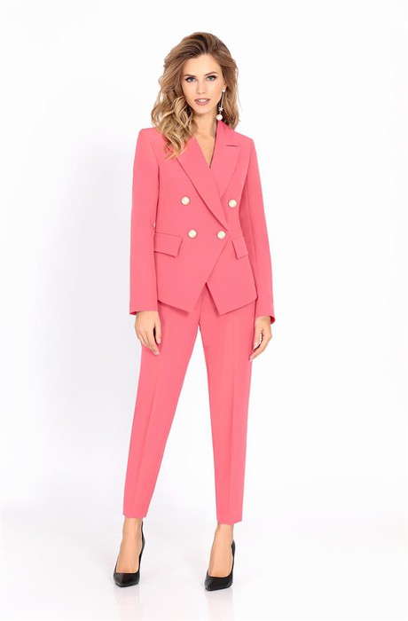 Текстильный костюм-двойка из приталенного жакета фурнитурой под золото и укороченных брюк со стрелками. Детали: пиджачный воротник, нагрудные вытачки, прорезные карманы с фигурными клапанами, рукава втачные со шлицей, съемный пояс, жакет на подкладке; брюки со средней посадкой на притачном поясе, на передних половинах складки и заутюженные стрелки, застежка на молнию и пуговицу, боковые карманы.
