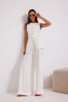 Костюм-двойка из свободной блузы с шалевым воротником и широких брюк из фактурной вискозы.