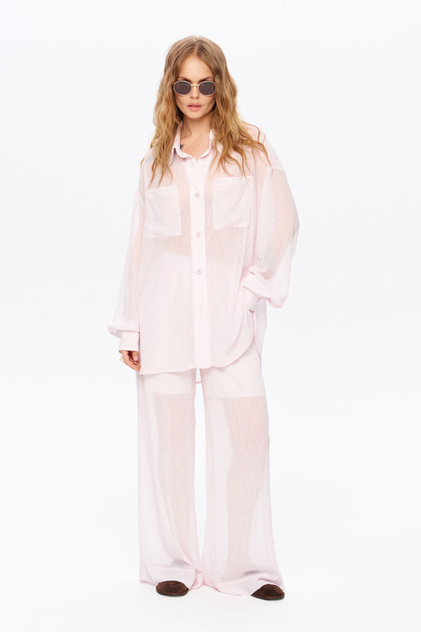 Костюм-двойка из свободной рубашки и широких брюк на резинке из полупрозрачного фактурного шифона.