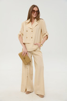 Костюм-двойка из приталенного жакета с акцентными плечами и укороченных классических брюк со стрелками.