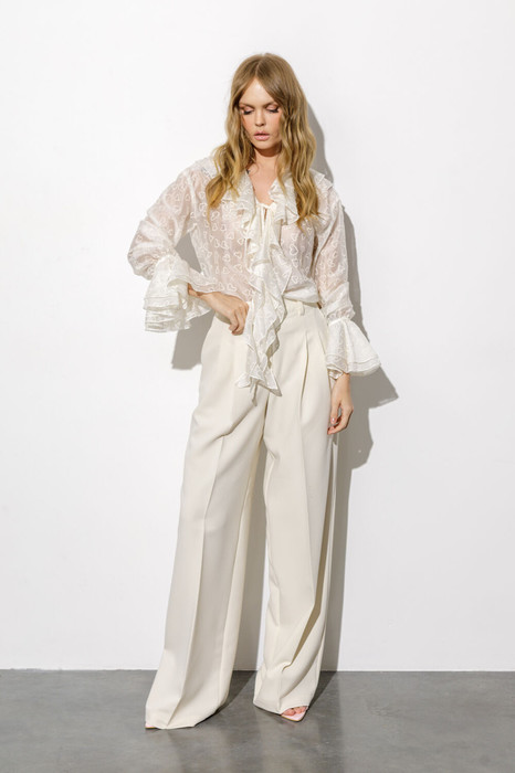 Комплект-двойка из полупрозрачной блузы с вышивкой и широких брюк-палаццо со стрелками.