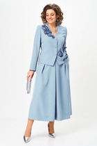 Детали: блуза свободного силуэта, воротник-стойка, рукава-реглан с широкими манжетами-оборками, манжеты с застежкой на петли и пуговицы. Брюки с высокой посадкой на притачном эластичном поясе, без застежки, боковые карманы, низ брюк с эластичными манжетами, брюки без подкладки.