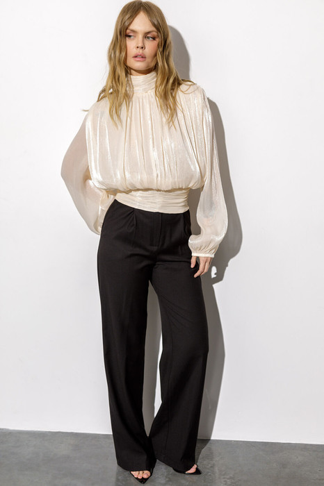 Комплект-двойка из укороченной струящейся блузы и прямых широких брюк.