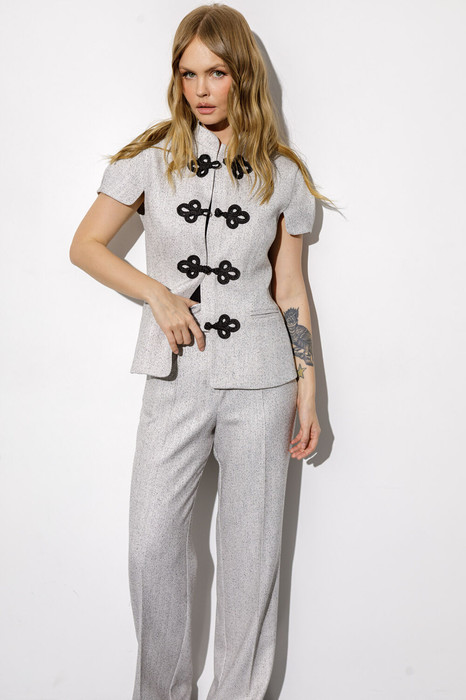 Детали: жакет прилегающего силуэта, талиевые вытачки и рельефы по переду, спинка со средним швом и рельефами, фигурный короткий рукав со складкой, воротник-стойка, функциональные карманы в рамку, центральная застёжка на 4 декоративные пуговицы с подзором, жакет на подкладке. Брюки с притачным поясом со шлевками, высокая посадка, передние половины с небольшими застроченными мягкими складками и заутюженными стрелками, застежка на молнию и пуговицу, боковые карманы.