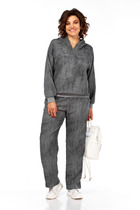 Костюм молодежный из трикотажного полотна «кулирка» в комбинации двух видов: с набивным рисунком и гладкокрашенного в единой цветовой гамме, состоящий из футболки и брюк. Футболка - из гладкокрашенного полотна, классического покроя, с короткими втачными рукавами, горловиной овальной формы и принтом на полочке, выполненным в технике «шелкографии». Горловина обработана втачной планкой из основного материала. Брюки - из полотна с набивным рисунком, длинные, слегка расширенные книзу, с карманами в боковых швах, на притачном поясе с эластичной тесьмой внутри.