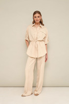 Блуза свободного силуэта без застёжки на запах со съемным поясом. Перёд и горловина на притачной планке. Спинка без среднего шва. Рукав втачной одношовный со спущенным плечевым швом на резинке по низу.