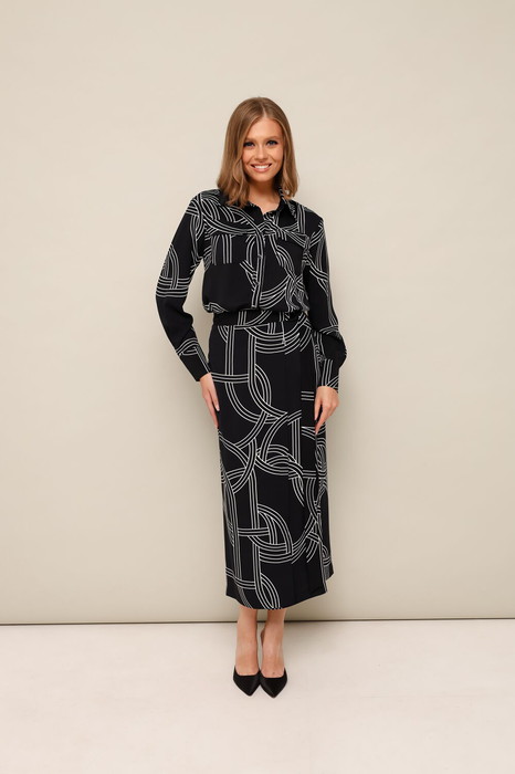 Комплект 2-предметный, состоящий из блузки и юбки на запах. Блузка прямого кроя, горловина обработана воротником на стойке, застежка на притачной планке на петли и пуговицы. Перед блузки с накладными карманами с клапанами. Рукава длинные с притачной манжетой с застежкой на пуговицы. В боковых швах обработаны разрезы. Юбка на запах в длине миди. Притачной пояс с застежкой на полукольца, внутри фиксируется на пришивные кнопки.