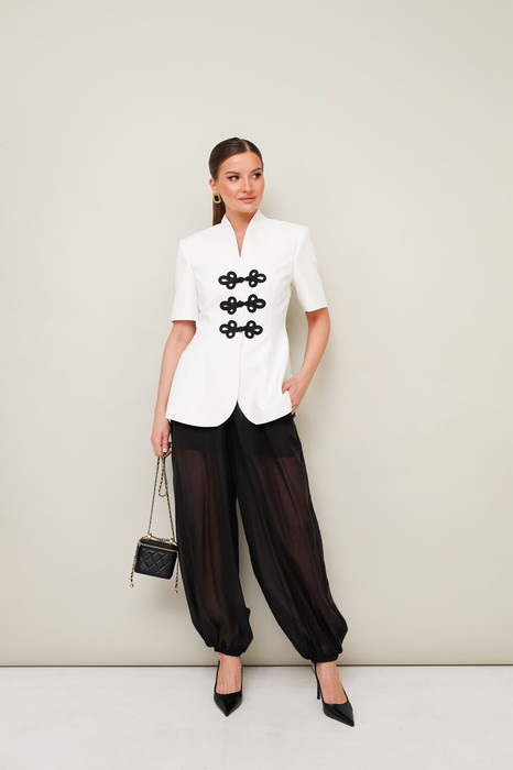 Стильный 2-х предметный комплект в актуальном восточном стиле, состоящий из жакета и брюк.