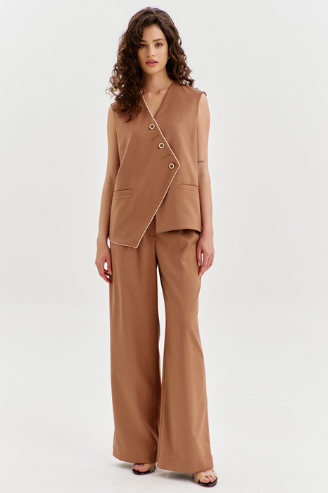 Комплект, состоящий из жилетки и брюк. Жилетка свободного кроя, длиной чуть выше линии бедер, с ассиметричной линией низа. Спинка с ассиметричным швом. Перед с прорезными карманами с листочкой. Застежка ассиметричная на петли и пуговицы. Жилетка на подкладке. Брюки длинные, широкие. По задним половинкам талиевые вытачки. По передним половинкам односторонние складки, боковые карманы и застежка на тесьму-«молнию» с гульфиком и откоском. Брюки на притачном поясе, по спинке с резинкой. По поясу вставлены шлевки.