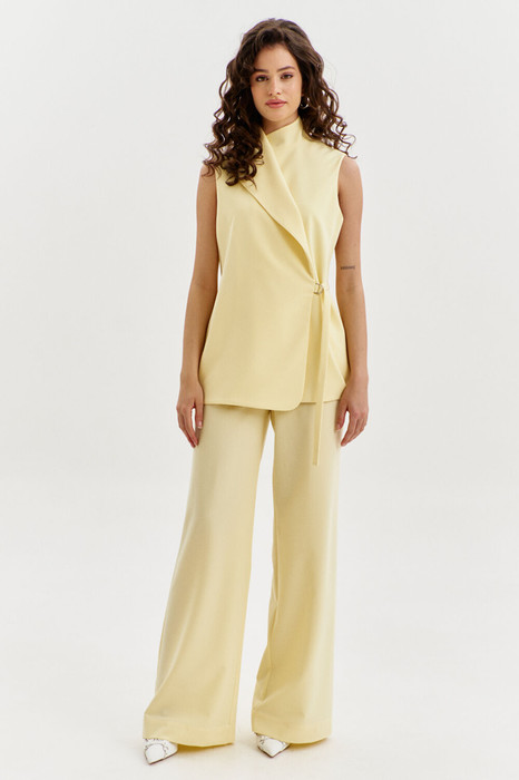 Комплект, состоящий из жилета и брюк. Жилет свободного кроя, длиной чуть ниже бедер. Спинка со средним швом. Перед ассиметричный: правый перед с воротником «апаш», левый перед с воротником стойка. Застежка двубортная на пояс с полукольцами. Жилет на подкладке. Брюки прямого силуэта, на притачном поясе с резинкой по спинке. По задним половинкам талиевые вытачки. По передним половинкам обработаны боковые карманы с наклонным входом, и застежка на тесьму-«молнию» с гульфиком и откоском. По поясу застежка на петлю и пуговицу