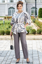 Комплект, состоящий из жилетки, топа и брюк. Жилетка свободного кроя, длиной выше колена. Спинка со средним швом, в котором обработан разрез. Перед с нагрудной вытачкой. Пройма глубокая, квадратной формы. Воротник пиджачного типа со стойкой. Жилетку дополняет шифон по спинке и переду. Жилетка без застежки на подкладке. Топ на бретелях, двойной, длиной выше бедер, с неровной линией низа (спинка удлинена). По переду топа нагрудные вытачки. Брюки длинные, широкие, на притачном поясе с резинкой. По спинке талиевые вытачки. По переду, с правой стороны, вставлена деталь из шифона, выполнена в виде запаха, которая крепится с левой стороны при помощи пояска и паты с полукольцами. В боковых швах обработаны карманы.