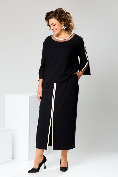 Костюм женский, 2ух-предметный, блузон и юбка. Блузон женский, прямого силуэта, длиной до линии бёдер. Перед с 2-мя нагрудными вытачками, с отделочной планкой по горловине. Спинка цельнокроеная. Горловина круглая, без воротника, обработана косой бейкой из отделочной ткани шириной 1,2 см. Блузон со спущенным плечом. Рукав втачной 2-х шовный, длиной 3/4. Срезы верхнего шва обработаны косой бейкой из отделочной ткани шириной 1,2 см и закреплены частично на планке, верхний шов заканчивается разрезом. Юбка женская "карандаш" длиной до нижней части икры. Переднее полотнище с карманами в боковых швах, со средним швом, заканчивающимся разрезом, срезы среднего шва обработаны косой бейкой из отделочной ткани, шириной 1,2 см и закреплены на планке. Заднее полотнище с 2-мя таллиевыми вытачками. Юбка с притачным поясом, собранным на эластичную тесьму, закреплённую 2-мя отделочными строчками. Юбка на подкладке. Длина юбки по боковому срезу 88 см. Длина спинки блузона 57 см, длина рукава 44 см.