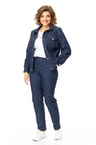 Костюм женский относится к нарядной торжественной одежде. Костюм женский 2-х предметный жакет и брюки. Жакет женский полуприлегающего силуэта, длиной до линии бёдер. Перед с 2-мя нагрудными вытачками с притачными планками по горловине, декорированными надстрочной отделочной тесьмой, с 2-мя надстрочными вертикальными планками, с 2-мя прорезными карманами с клапаном с закруглёнными концами и листочкой, клапан декорирован надстрочной отделочной тесьмой, карманы расположены ниже линии талии на 2 см. Спинка с 2-мя таллиевыми вытачками и средним швом. Горловина круглая, обточная, без воротника. Застёжка центральная бортовая на 6-ть вертикально обмётанных петель и 6-ть пришивных пуговиц. Рукав 2-х шовный втачной, длиной 3/4. Жакет на притачной подкладке. Брюки женские, широкие, длинные. Передние половинки со встречными складками с карманами в боковых швах. Задние половинки без конструктивных особенностей. Брюки с притачным поясом, собранным на эластичную тесьму, закреплённую 2-мя отделочными строчками. Длина спинки жакета 58 см, длина рукава 48 см. Длина брюк по боковому срезу 99 см.
