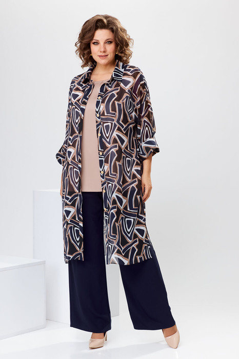 Комплект женский 3-х предметный кардиган, топ и брюки. Кардиган женский прямого силуэта, длиной ниже колена на 5 см. Перед с 2-мя притачными вертикальными планками. Спинка цельнокроеная. Горловина круглая с втачным воротником рубашечного типа с отрезной стойкой. Застёжка центральная на 9-тьпроьивных металлических кнопки. Боковые швы с разрезами. Кардиган со спущенным плечом. Рукав втачной, одно шовный, длиной 3/4 с притачной манжетой и хлястиком, поддерживающим манжету и фиксирующимся к рукаву на 1-ну пробивную кнопку. Кардиган без плечевых накладок. Топ женский прямого силуэта, длиной др линии бёдер. Перед с 2-мя нагрудными вытачками. Спинка цельнокроеная. Горловина круглая, обточная, без воротника. Проймы обточные. Брюки длинные прямые. Передние половинки с карманами в боковых швах. Задние половинки с таллиевыми вытачками. Брюки на притачном поясе, собранным на эластичную тесьму, закреплённую 2-мя отделочными строчками. Длина спинки кардигана 106 см, длина рукава 28 см, длина рукава от горловины 55 см. Длина брюк по боковому срезу 102 см. Длина спинки топа 62 см.