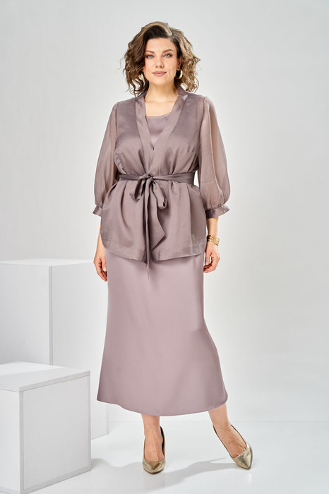 Комплект женские, относится к торжественной и нарядной одежде. Комплект женский, 2-х предметный, кардиган и платье. Кардиган женский, прямого силуэта. Перед с 2-мя нагрудными вытачками. Спинка цельнокроена. Горловина с V-образным вырезом с притачной планкой по краю борта и горловине. Кардиган без застёжки, фиксируется на съёмный пояс. Рукав втачной, одно шовный, длиной 3/4, по низу со сборкой и притачной манжетой. Кардиган без плечевых накладок. Платье женское, полу прилегающего силуэта, слегка расширено к низу, длиной до нижней части икры. Перед с 2-мя нагрудными вытачками. Спинка со средним швом и 2-мя таллиевыми вытачками. Горловина круглая обточная без воротника. Застёжка на потайную тесьму молнию в левом боковом шве платья. Платье без рукавов, проймы обточены. По краю пройм и краю горловины отделочная строчка-0,6 см.