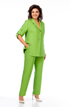 Комплект из костюмной ткани на подкладке, состоящий из жакета и юбки. Жакет прямого силуэта с нагрудными вытачками и прорезными карманами с клапанами. Воротник - стойка. Рукава - реглан, длинные. Жакет застегивается на пришивные кнопки. Цветок ручной работы, расположение можно поменять самостоятельно. Юбка на подкладке, с отлетной деталью и поясом-обтачкой.  В среднем шве заднего полотнища юбки - застежка-молния и разрез.