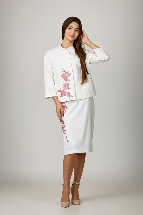 Комплект из костюмной ткани на подкладке, состоящий из жакета и юбки. Жакет прямого силуэта с нагрудными вытачками. Воротник - стойка. Рукава - реглан, трехчетвертные. Жакет застегивается на пришивные кнопки. Юбка на подкладке, слегка зауженная к низу, без пояса. Верх юбки обработан обтачкой. Шлица, застежка - молния в среднем шве заднего полотнища юбки. Отделочные  настрочные  детали  по жакету и юбке.